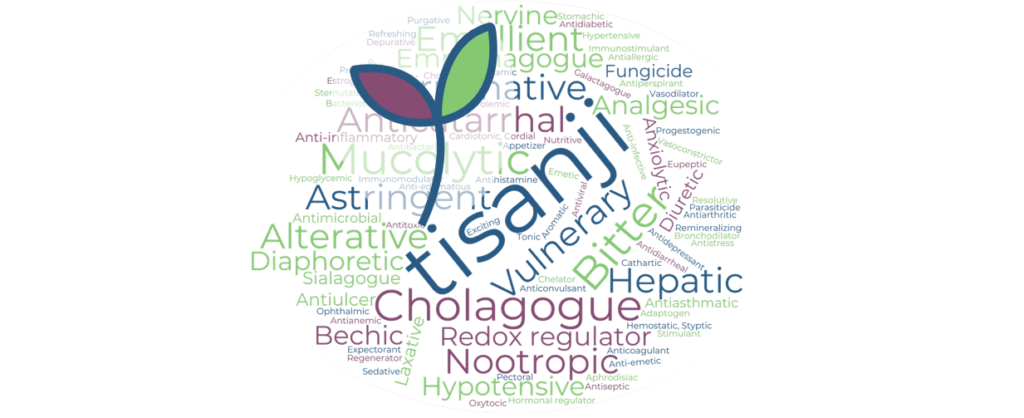 Plantes utiles en interne: bardane (Arctium lappa), fumeterre (Fumaria officinalis), hydraste du Canada (Hydrastis canadensis), ortie (Urtica dioica), pensée sauvage (Viola tricolor) scrofulaire (Scrophularia nodosa), trèfle rouge (Trifolium pratense)