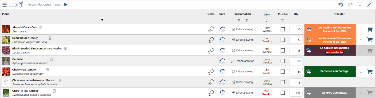 tisanji creates a list of seeds and plants to be procured according to your garden plan, and tells you when it’s time to start the activities.