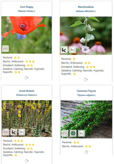 Example: I have a severe cough that prevents me from sleeping. I’m looking for plants in my garden (either in the application or within the plants cards) that have some of these properties: pectoral, bechic (anti-cough), emollient, immunostimulant and sedative. Of course I could also look within the Wiki for the best plants, but I like to start with what I already have.