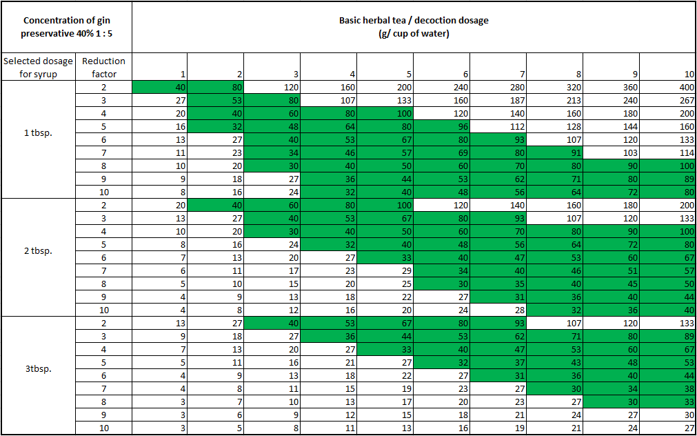 - Define a syrup dosage (1 to 3 tablespoons) and a reduction factor that works for all the plants chosen (most of the boxes in green or close to it);